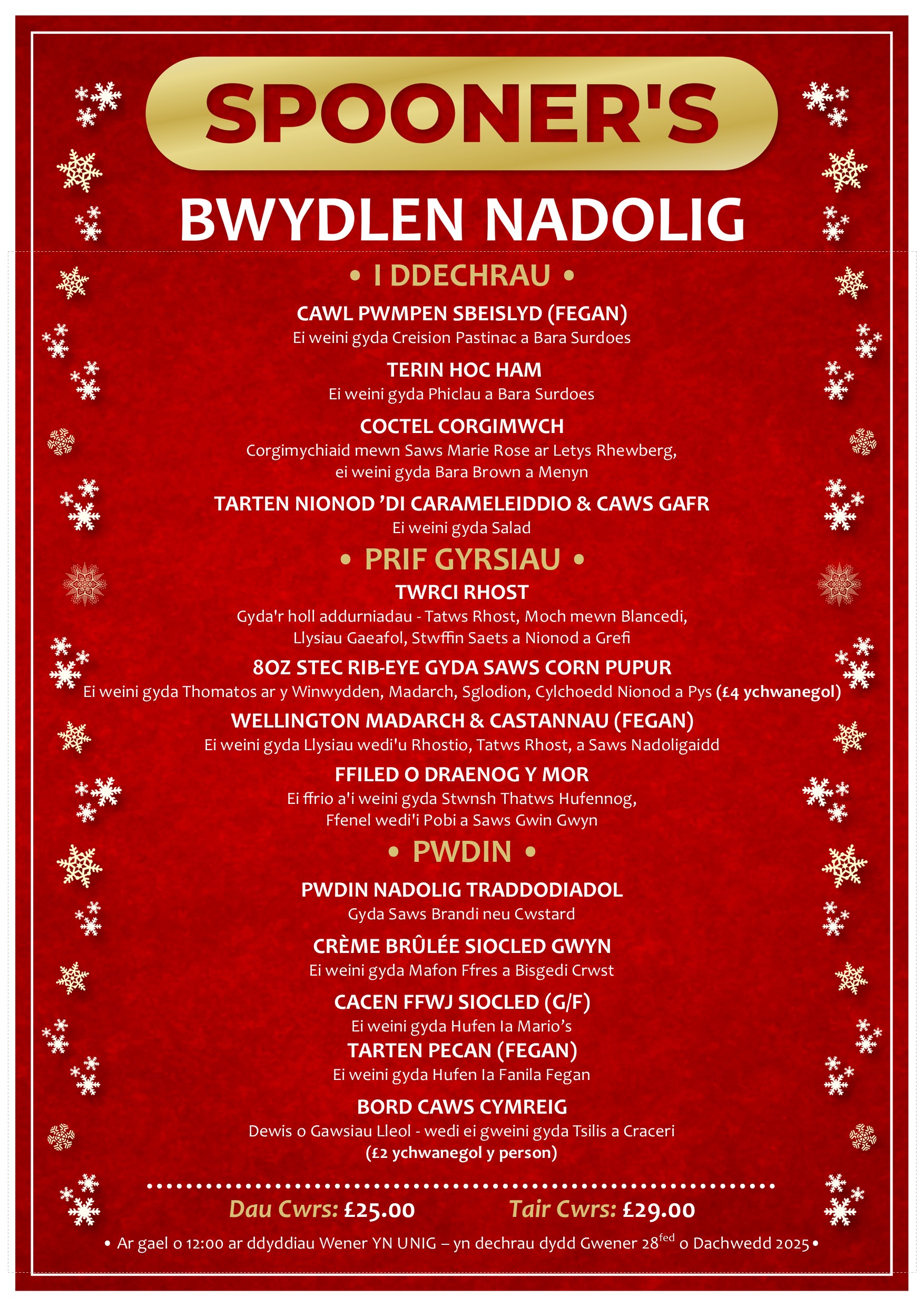 Rhaid archebu ein Bwydlenni Nadoligaidd ymlaen llaw a bydd angen archebu ymlaen llaw hefyd. Nodwch unrhyw ofynion dietegol ar adeg archebu.